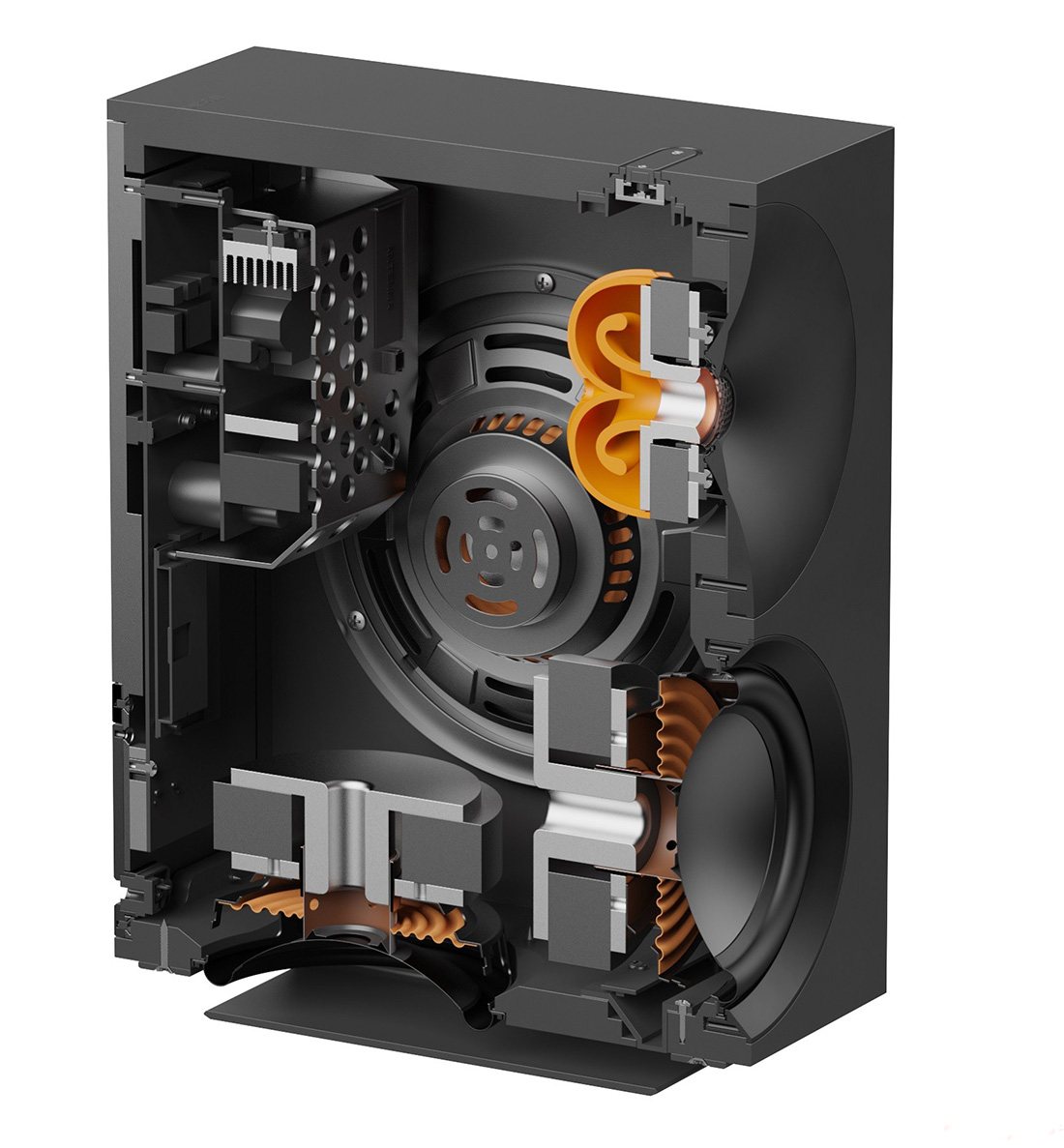 Druga bas jedinica smještena je na dnu zvučničke kutije i usmjerena je prema dolje. Obje bas jedinice rade zajedno s dvostrukim 6-inčnim pasivnim radijatorima (jedan po strani) podešenim na 38 Hz za dodatno proširenje bas područja do donje srednje vrijednosti od 30 Hz.